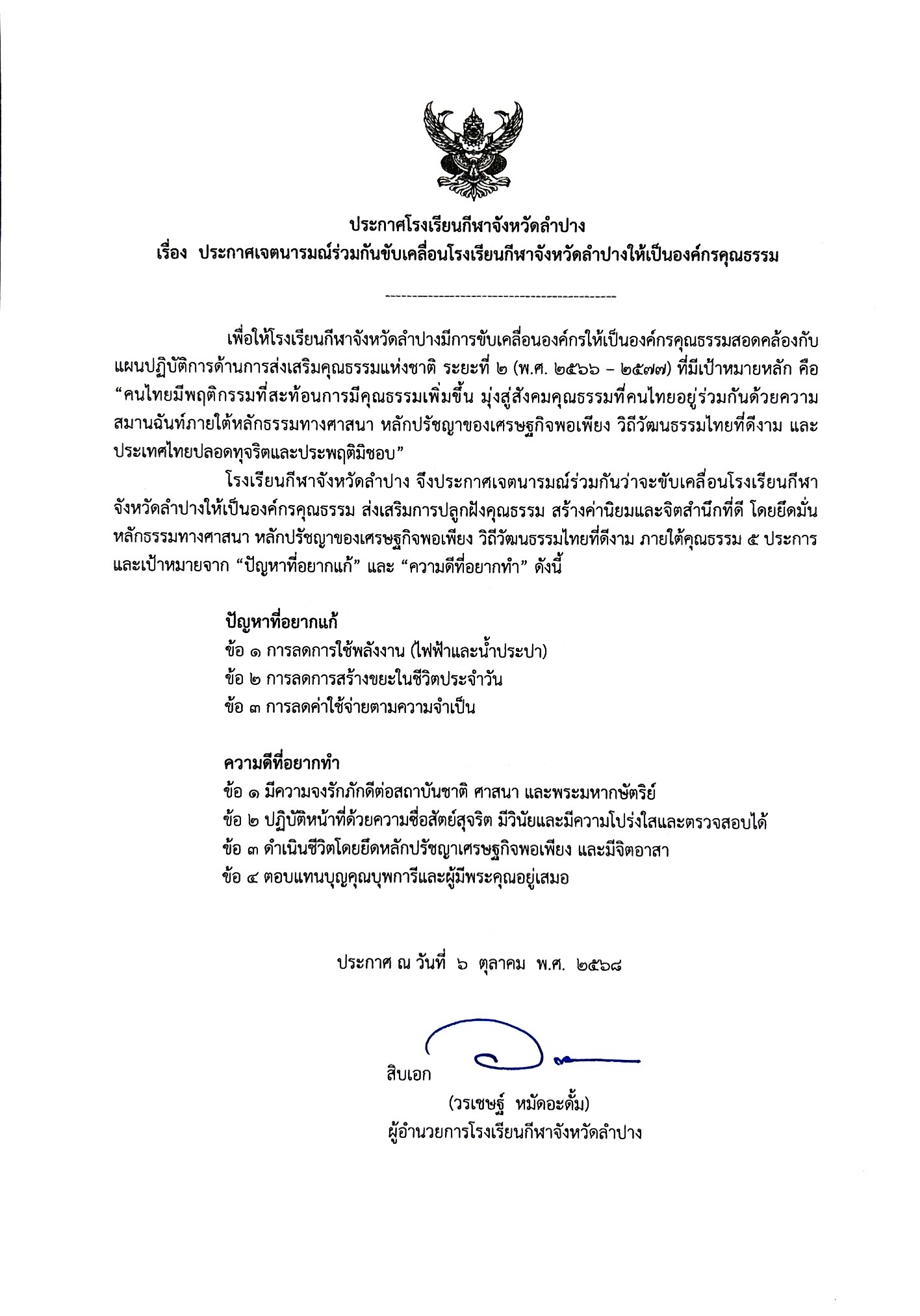 ประกาศโรงเรียนกีฬาจังหวัดลำปาง เรื่อง ประกาศเจตนารมณ์ร่วมกันขับเคลื่อนโรงเรียนกีฬาจังหวัดลำปางให้เป็นองค์กรคุณธรรม