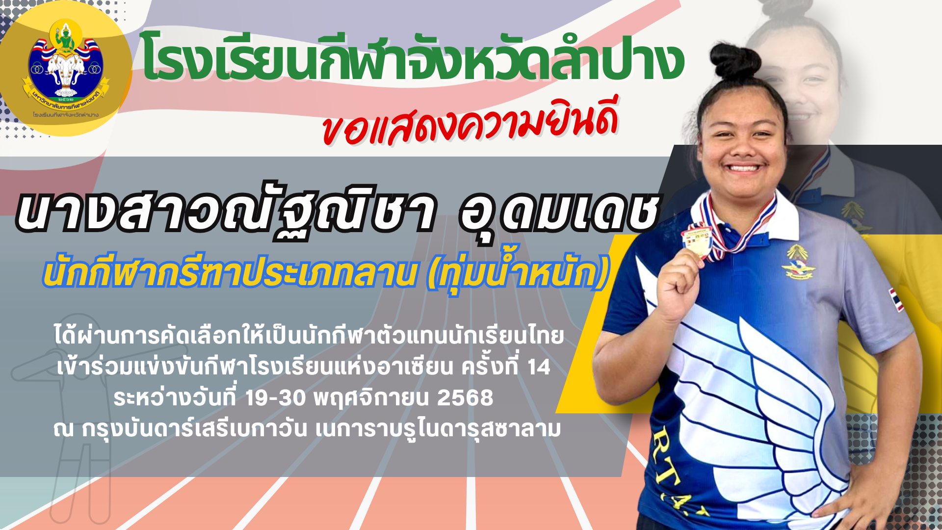 นักกีฬากรีฑาประเภทลาน (ทุ่มน้ำหนัก) ระดับชั้นมัธยมศึกษาปีที่ 3 ได้ผ่านการคัดเลือกให้เป็นนักกีฬาตัวแทนนักเรียนไทย เข้าร่วมแข่งขันกีฬาโรงเรียนแห่งอาเซียน ครั้งที่ 14 ระหว่างวันที่ 19-30 พฤศจิกายน 2568 ณ กรุงบันดาร์เสรีเบกาวัน เนการาบรูไนดารุสซาลาม